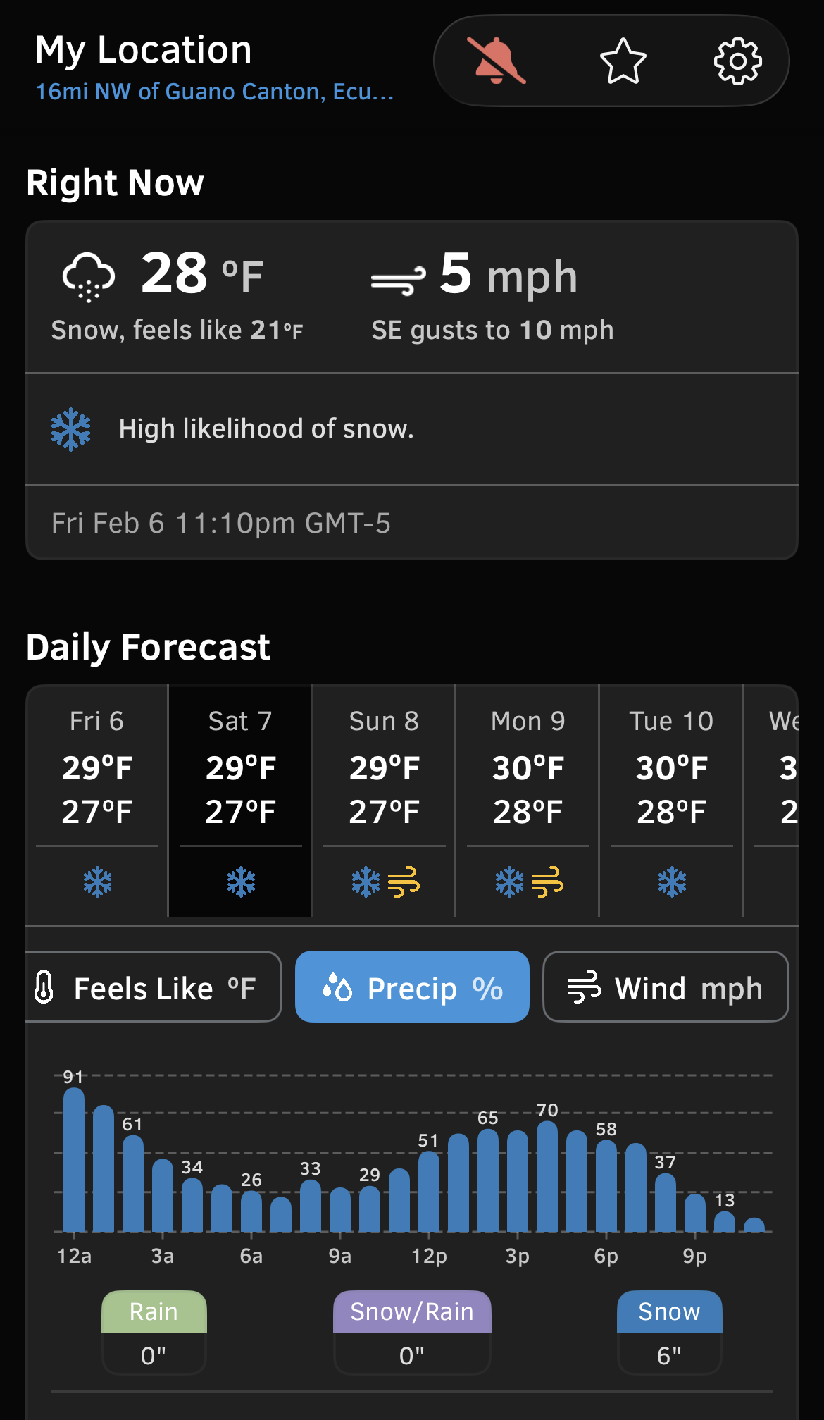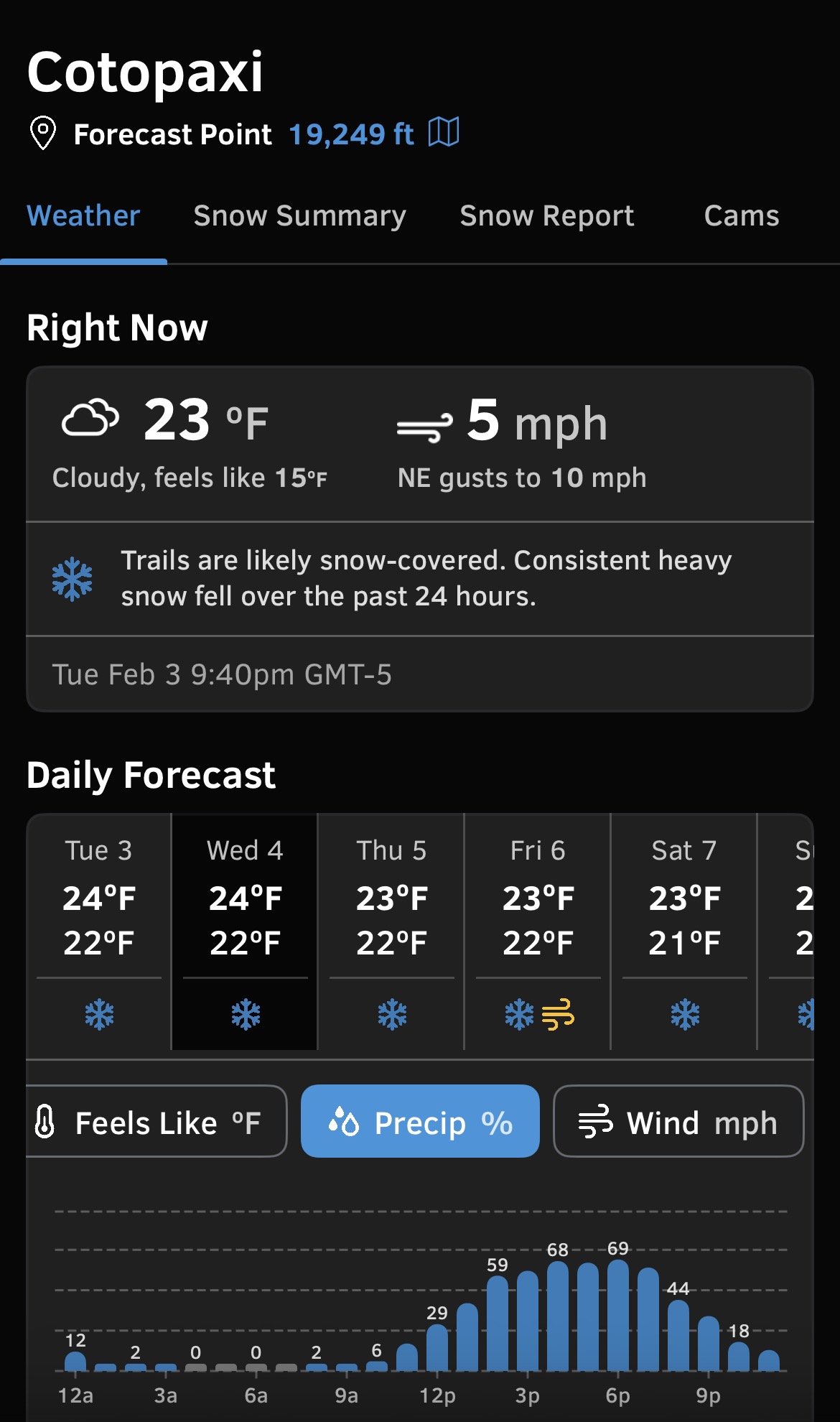 Now let’s talk about weather and weather forecasts. Something we heard constantly from the guides was to not trust the forecast, as they’re “not accurate in Ecuador”. I realize this is just an anecdote, but OpenSnow absolutely nailed the forecast while we were there.