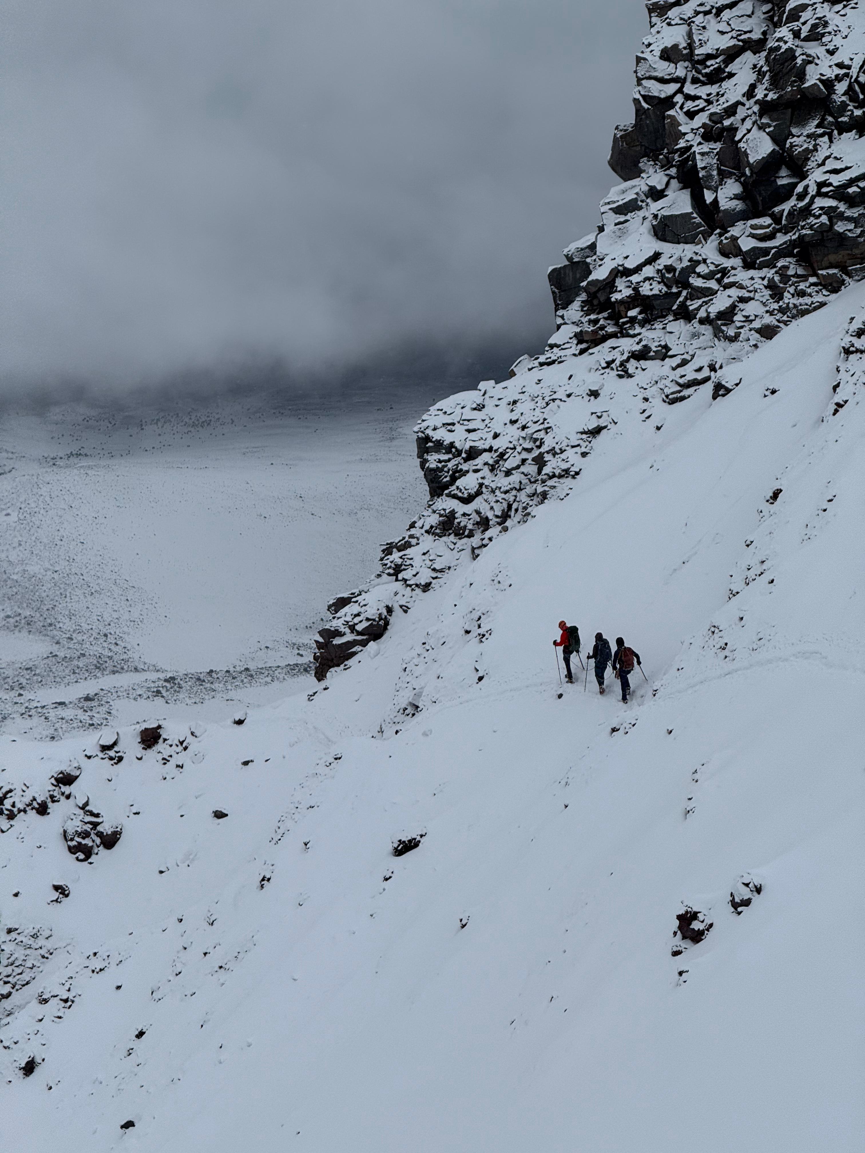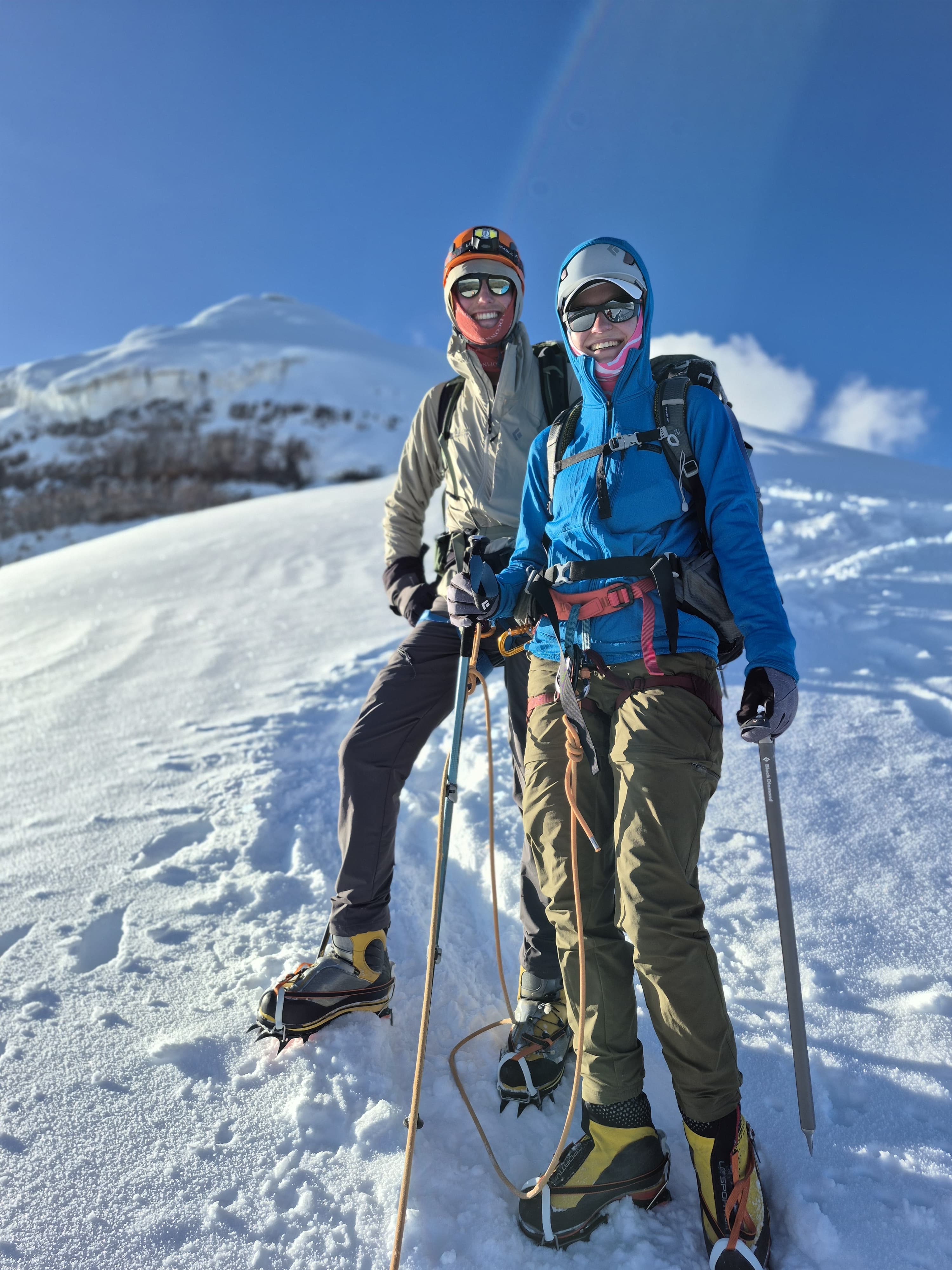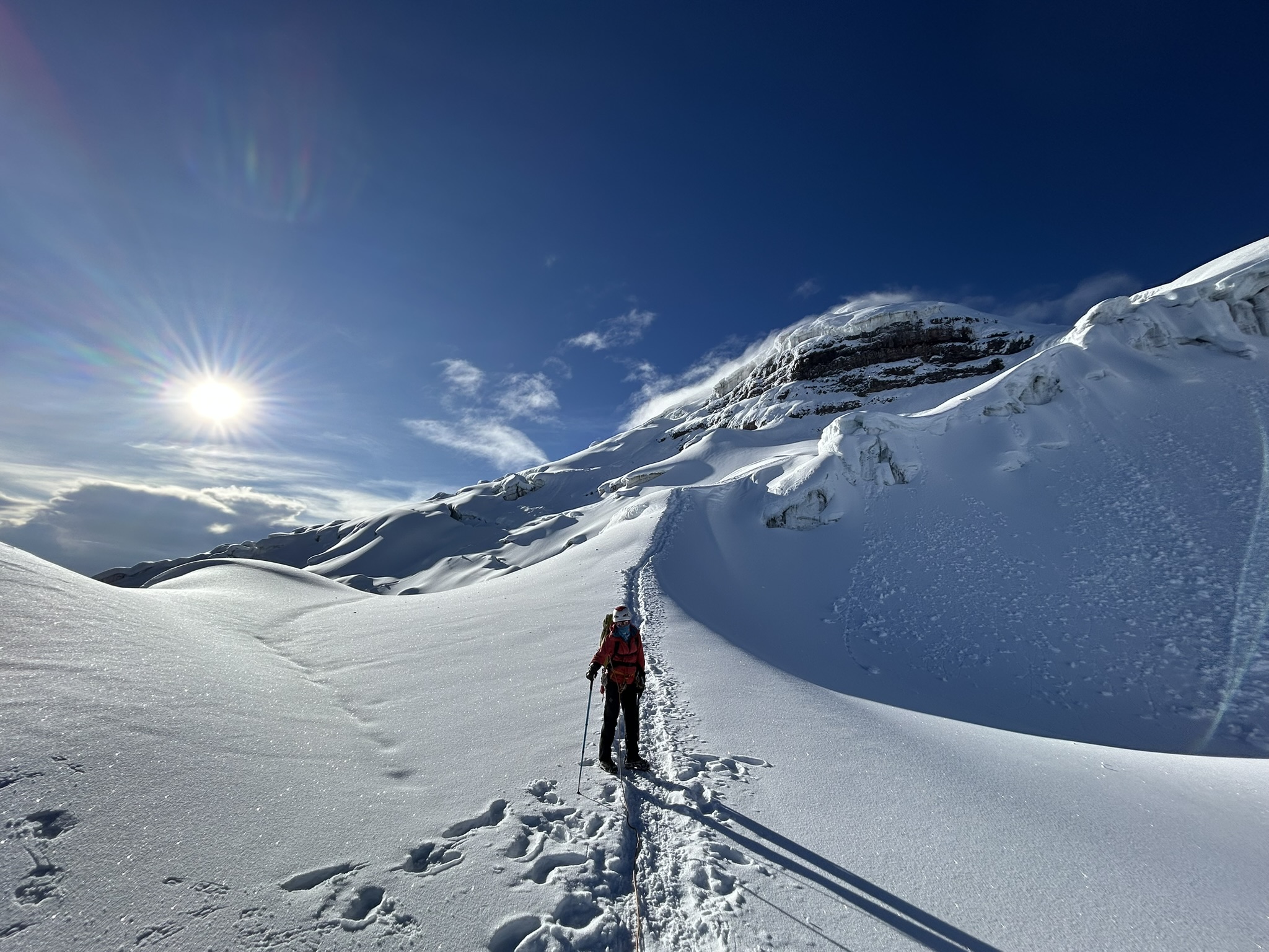 The “walk” was actually quite fun: a bit of a traverse, then a “rock step”, followed by some fairly steep snow up the ridge. We went about halfway up, 1500 vertical feet, though the guides assured us it was only ⅓ the total time, as the remaining climb to the top was quite challenging and would have taken “at least four more hours”.